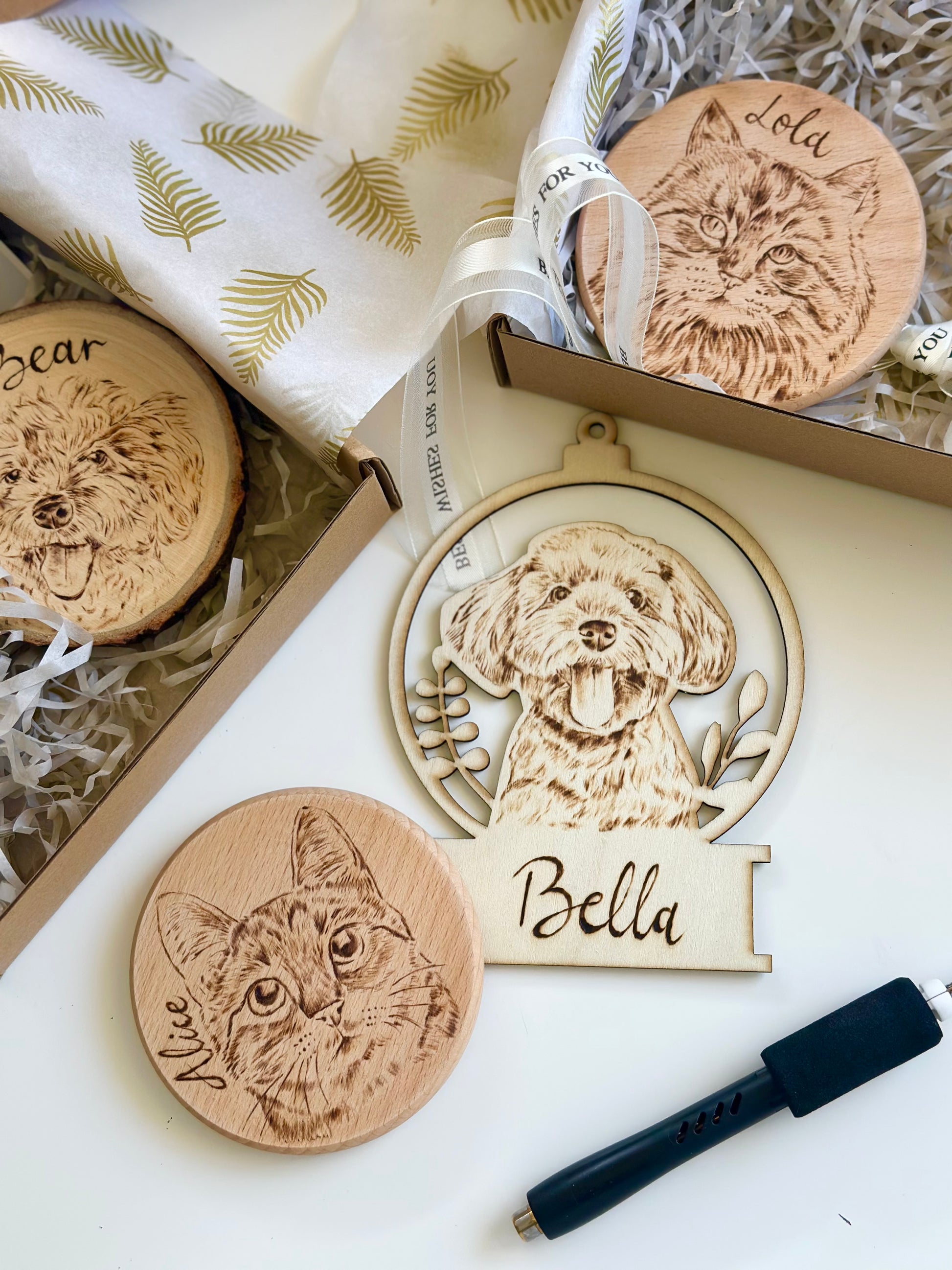 🎄 Custom Pet Portrait Christmas Set – Hand-Burned Pyrography Art