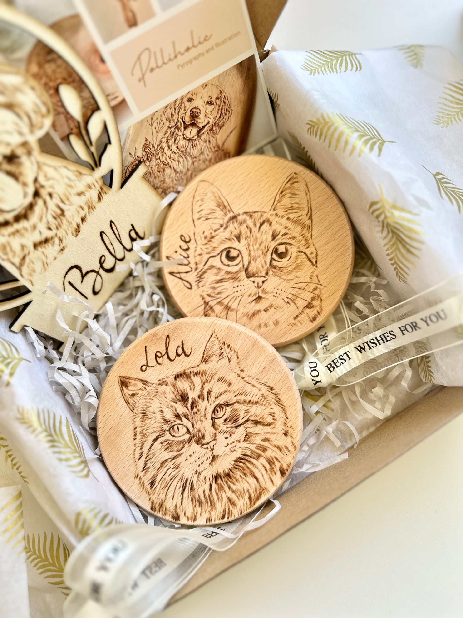 Each portrait will feature your pet’s likeness, hand-burned with fine detail and sealed for a smooth, lasting finish.